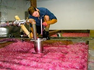 The winemakers had pressed off a whole bunch of Frontignac grapes and were going to dump everything else even though the grapes were still reasonably juicy (because you start getting more phenolics which you don’t want in the juice). Harry saw what they were doing and suggested we make for ourselves (not for sale) a bin of Frontignac white port. This is the bin the next day. The grapes went through a chiller so they were about 7C at this stage and my legs were freezing!